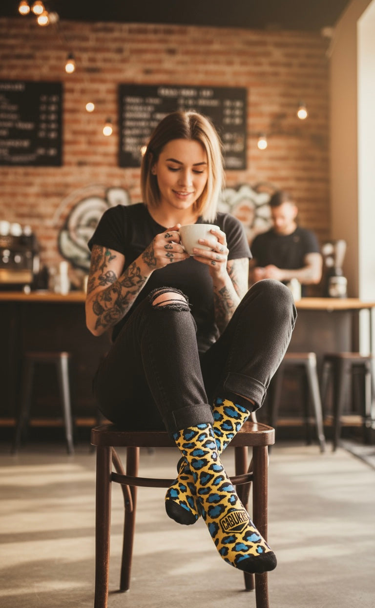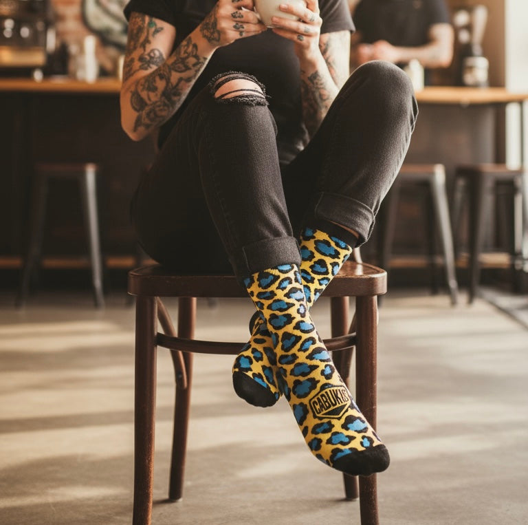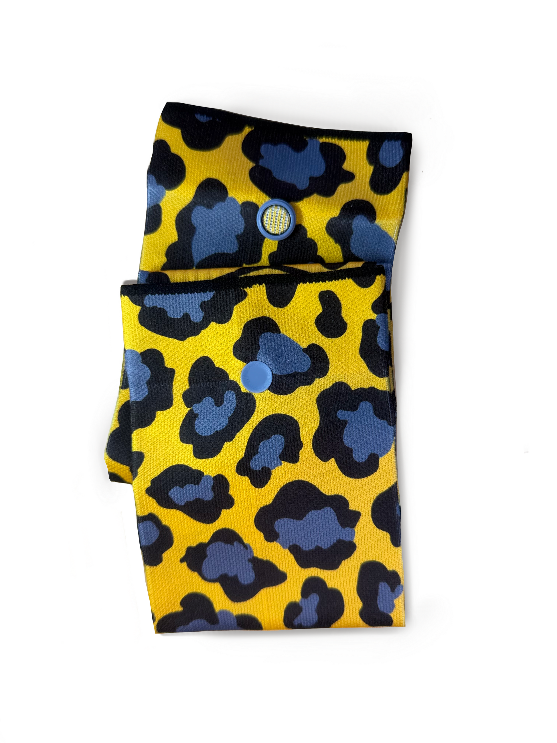 Explosión de color, energía y actitud. Este modelo combina un estampado animal print en negro con toques de azul eléctrico sobre un fondo amarillo vibrante, creando un diseño atrevido y único.