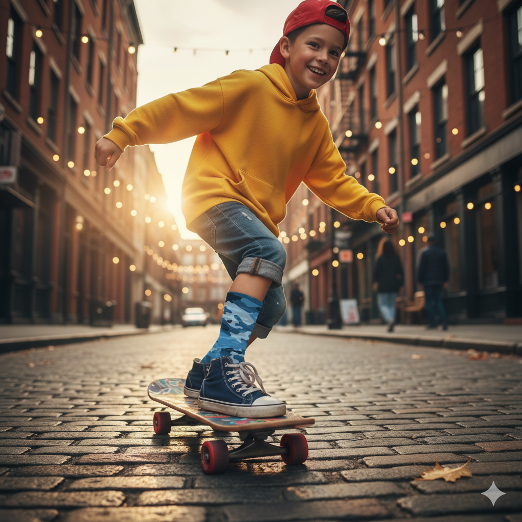 ¡Alerta, explorador! Estos no son calcetines normales, son tu uniforme secreto para la diversión. El diseño de Camuflaje Azul es perfecto para esconderte entre los arbustos o para ser el más pro en la pista de skate. ¿Qué incluye tu equipamiento?