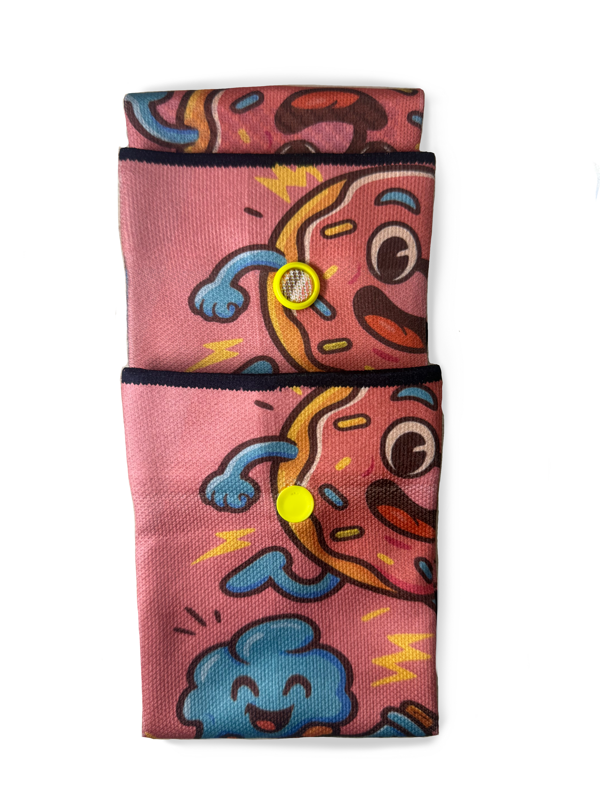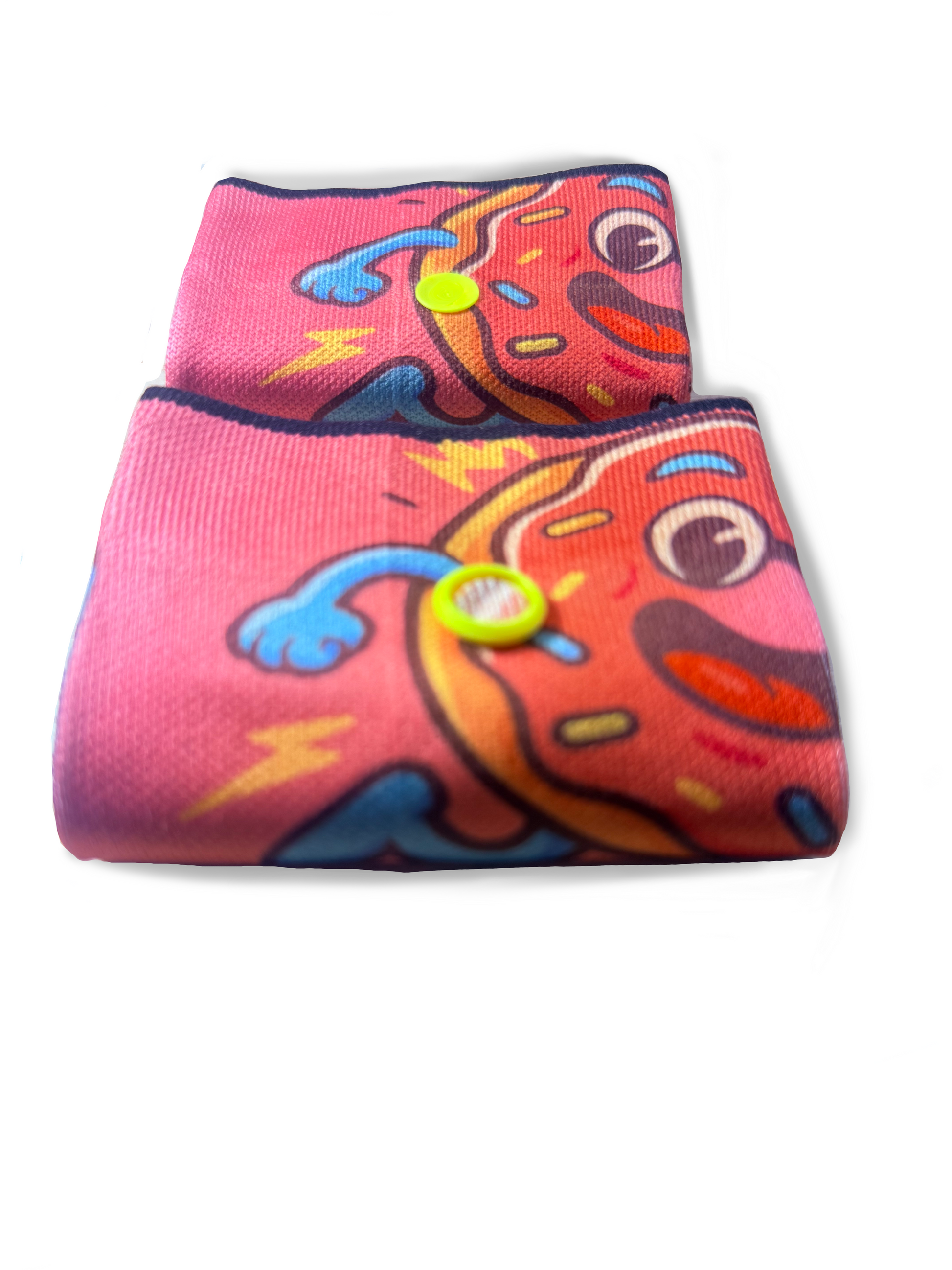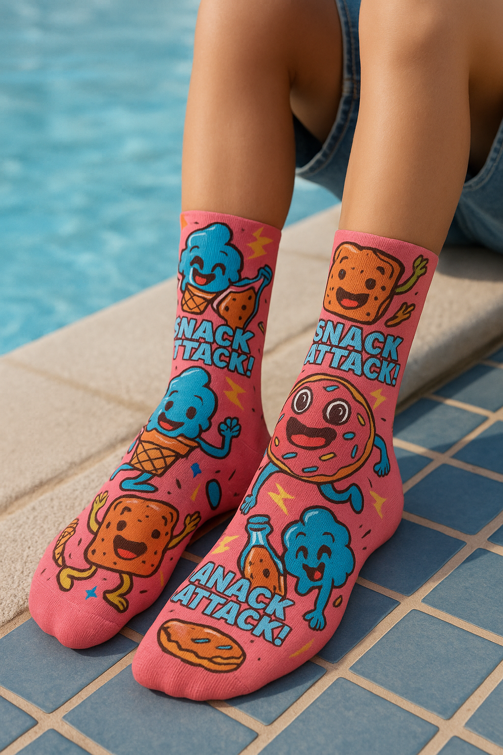 Diversión asegurada en cada paso. Estos calcetines infantiles mezclan colores vivos y un diseño juguetón con helados, donuts, snacks y pociones energéticas que cobran vida. El fondo coral resalta las ilustraciones en azul, naranja y rosa, transmitiendo un estilo alegre y gamberro.